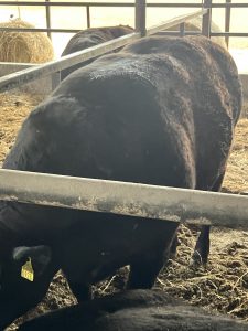 成績が向上した要因は3~4年前に配合飼料が高騰したときに長年使用していた銘柄を部会仲間も使用し始めていたことから同じものに変更したところ成績が向上し始めたということです。従来のやり方もその時に変更し導入にビタミン注射も廃止、飼い直し期間の育成飼料給与も止めたそうです。ビタミンコントコールは配合飼料に添加したものだけで行っています。変更後の事故は2年に1回程度の起立不能だけだそうです。写真は間もなく(2~3ヵ月以内に出荷する牛)ですが背中の盛り上がり、幅、臀部の丸みがお分かりになると思います。